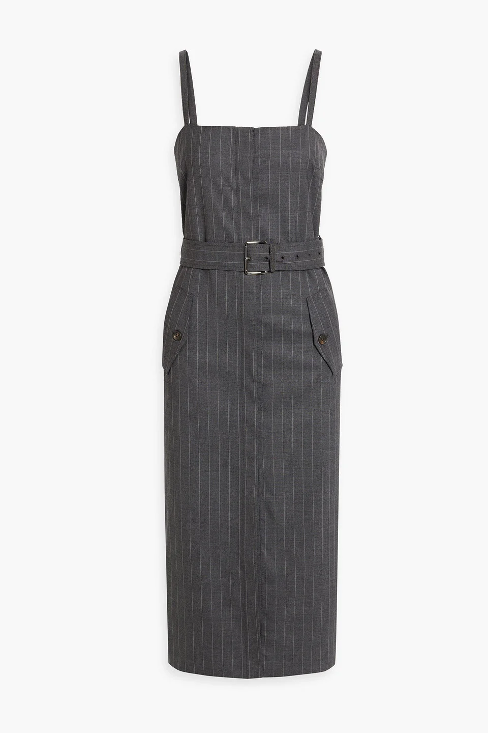 Belted pinstriped wool-blend midi dress