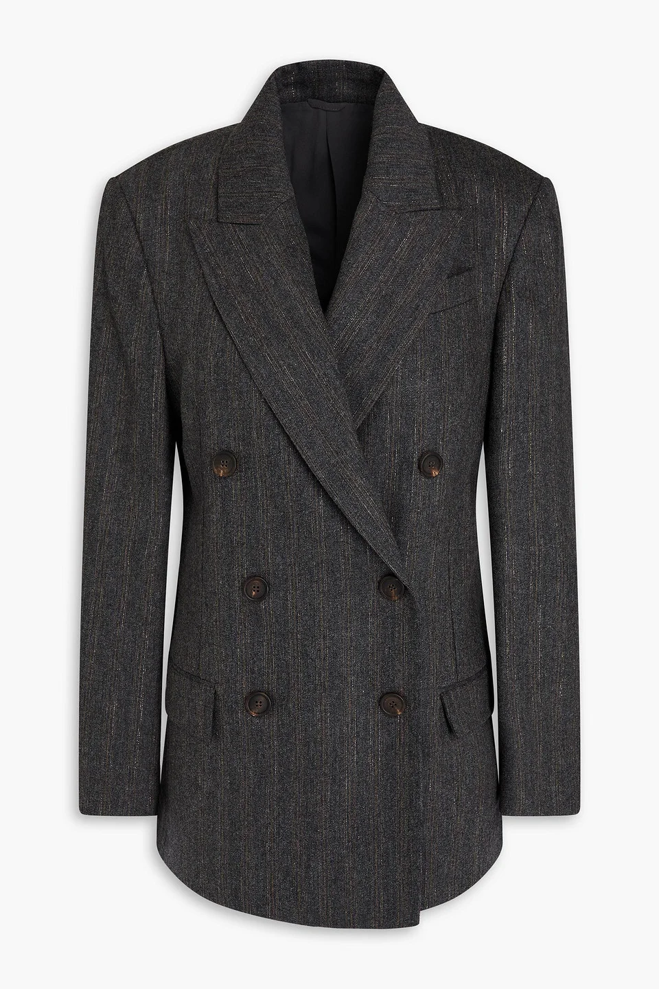 Blazer metallic pinstriped twill bead embellishment horn buttons shoulder pads buttoned cuffs breast pocket two front flap pockets button fastenings through double-breasted front fully lined back vent mid-weight, non-stretchy fabric dry clean made in italy Step out in style with Brunello Cucinelli’s blazer, a must-have for any fashion-forward wardrobe. The metallic twill and subtle bead embellishments create a look that is both modern and sophisticated. Ideal for important meetings or upscale dinners, this piece will make you feel empowered. 43% Wool 42% Virgin Wool 12% Polyamide 2% Viscose 1% Polyester Product Code 1647597348065014
