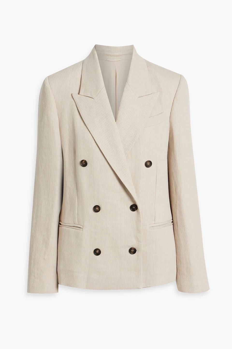 Blazer ribbed linen and cotton-blend buttoned cuffs two front welt pockets breast pocket button fastenings through double-breasted front partially lined mid-weight, non-stretchy fabric dry clean made in italy 78% Linen 22% Cotton Product Code 1647597348111933