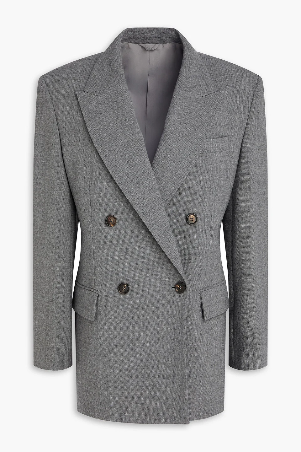 Blazer wool horn buttons shoulder pads side flap pockets breast pocket button fastenings through double-breasted front fully lined back vent mid-weight, non-stretchy fabric dry clean made in italy Step out in style with this double-breasted blazer from Brunello Cucinelli. The luxurious wool and tailored fit make it a standout choice for any occasion. Wear it over a simple top for a polished yet effortless look at after-work gatherings. 100% Virgin Wool 0% Horn Bubalus Bubalis (farmed): India Product Code 46376663162937652