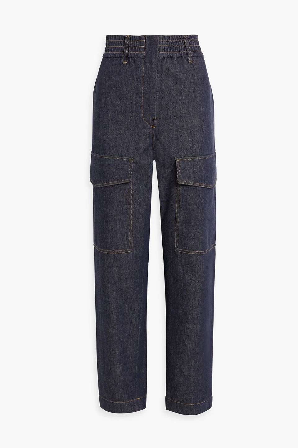 Tapered jeans denim elasticated waistband belt loops high-rise cut multipockets concealed hook, button and zip fastening at front non-stretchy fabric mid-weight fabric dry clean made in italy 100% Cotton Product Code 1647597333193960