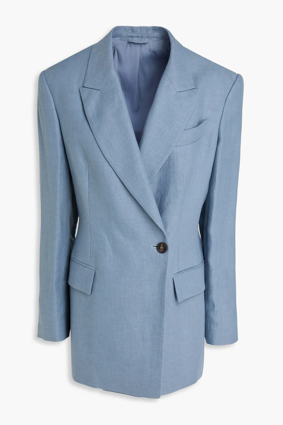 Blazer linen and hemp-blend horn buttons shoulder pads buttoned cuffs front flap pockets breast pocket button fastening at front fully lined back split mid-weight, non-stretchy fabric dry clean made in italy We know you're going to fall for this Brunello Cucinelli blazer, and so are we. It's impeccably tailored, with neat shoulder pads and horn buttons that punctuate a polished silhouette. Excellent for boardroom moments; layer over a crisp shirt and the coordinating trousers. 53% Hemp 47% Linen 0% Horn Bubalus Bubalis (farmed): India Product Code 46376663163063780