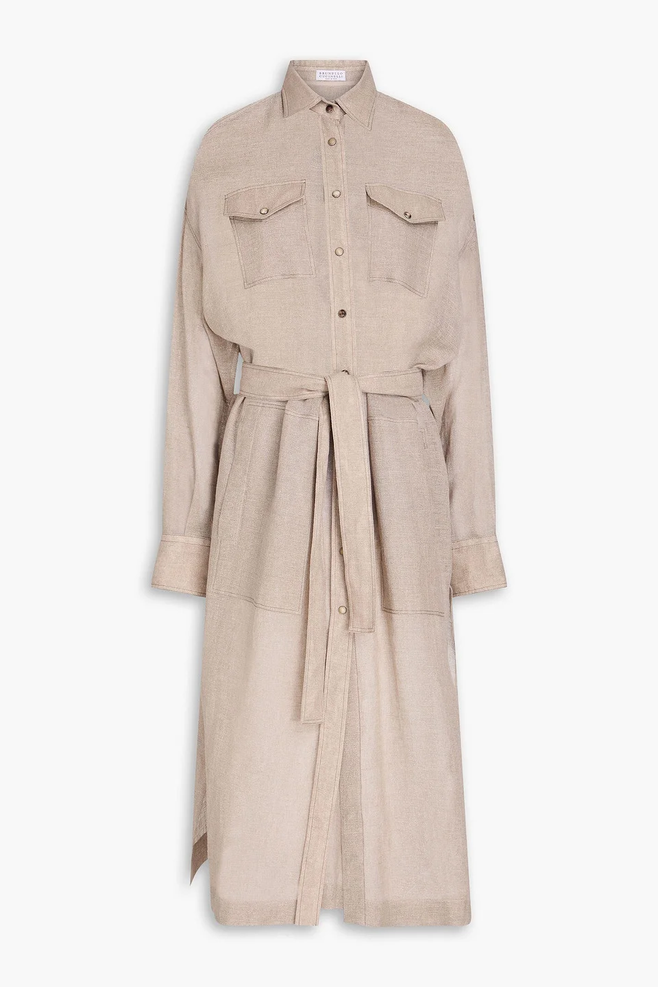 Shirt dress linen-blend horn buttons bead embellishment pleated back detachable waist tie snap-fastening cuffs breast pockets side slit pockets side splits snap fastenings through front lightweight, non-stretchy fabric dry clean made in italy 91% Linen 9% Polyamide 0% Brass 0% Horn Bubalus Bubalis (farmed): India Product Code 46376663163063736