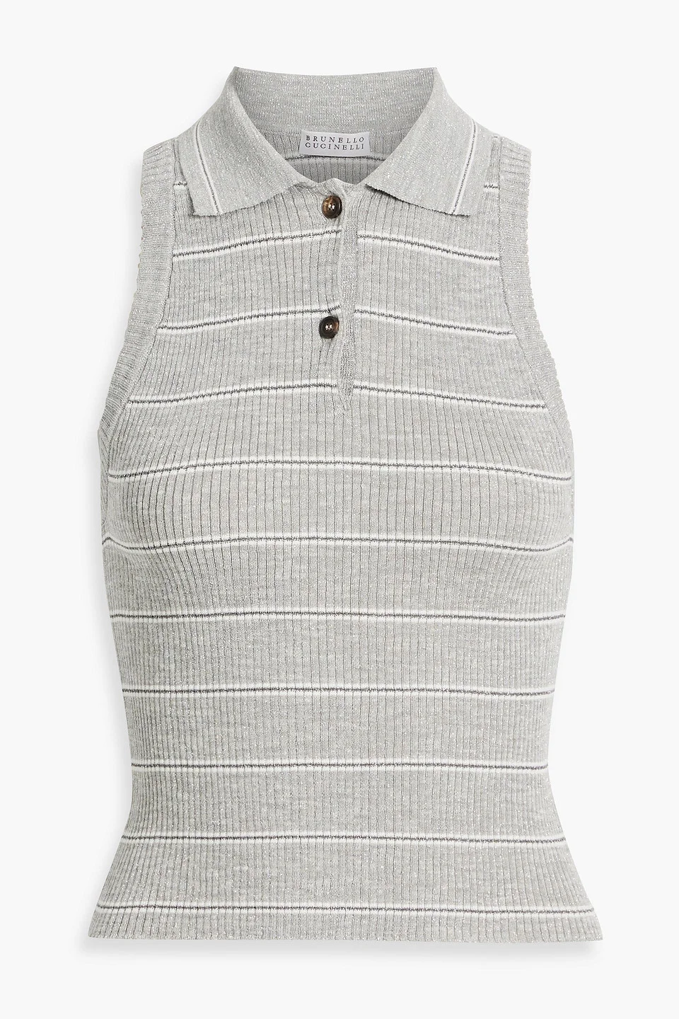 Top striped metallic ribbed-knit button fastenings along front mid-weight knit dry clean made in italy Looking for a really great addition to your wardrobe? Brunello Cucinelli's top is made from a soft ribbed-knit with a metallic striped effect that adds a touch of glam. Just add tailored pants and heels for a polished look. 45% Linen 37% Polyester 10% Metallic fiber 8% Polyamide Product Code 46376663162841802