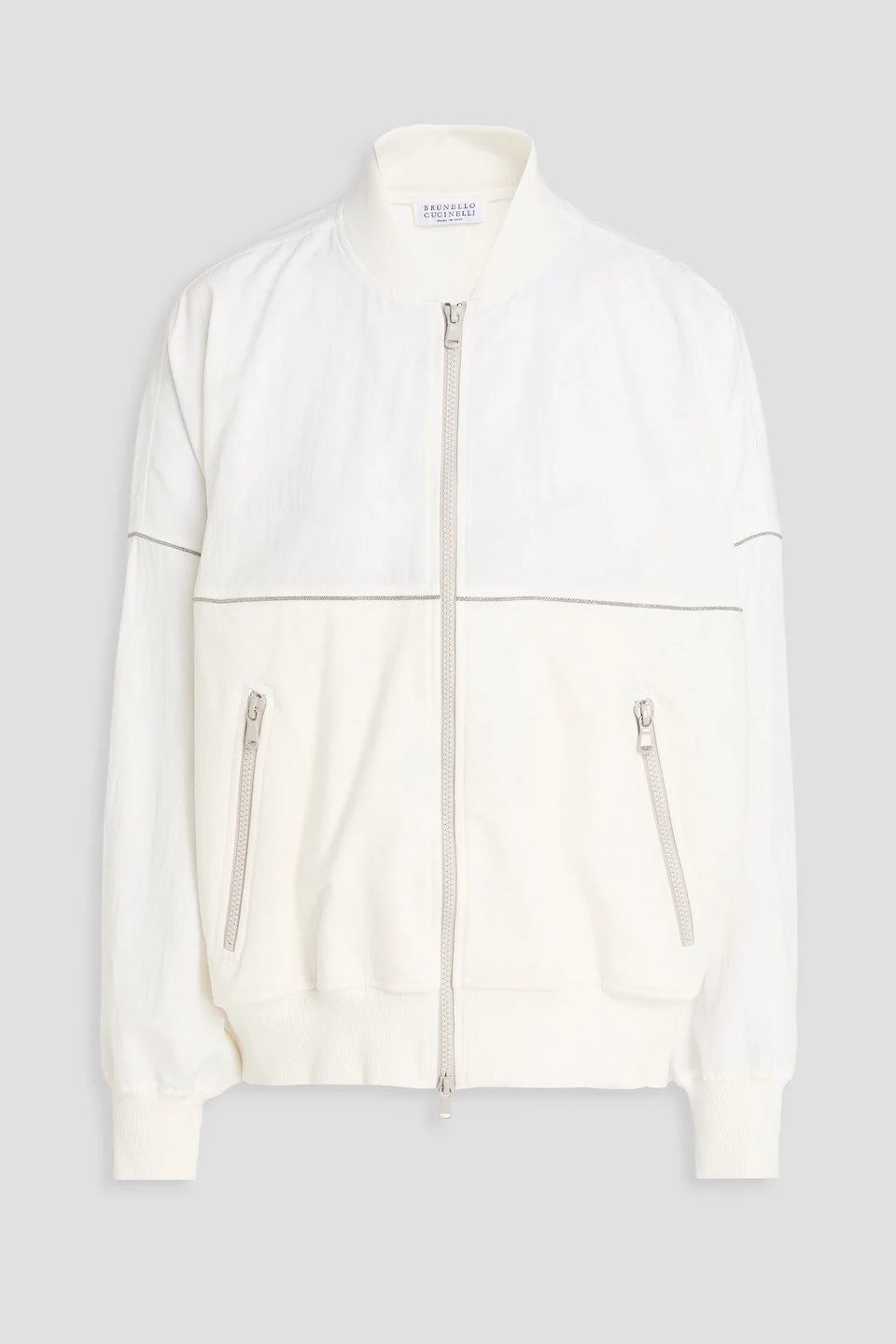 Jacket paneled french cotton-blend terry cotton-blend poplin bead embellishment ribbed trims zipped pockets two-way zip fastening through front lightweight, non-stretchy fabric dry clean made in italy Brunello Cucinelli's jacket has clean panels of French cotton-blend terry and poplin, embellished with the designer's signature beads. Wear with shorts or your favorite denim for the perfect off-duty look. 98% Cotton 2% Elastane Product Code 46376663163063817