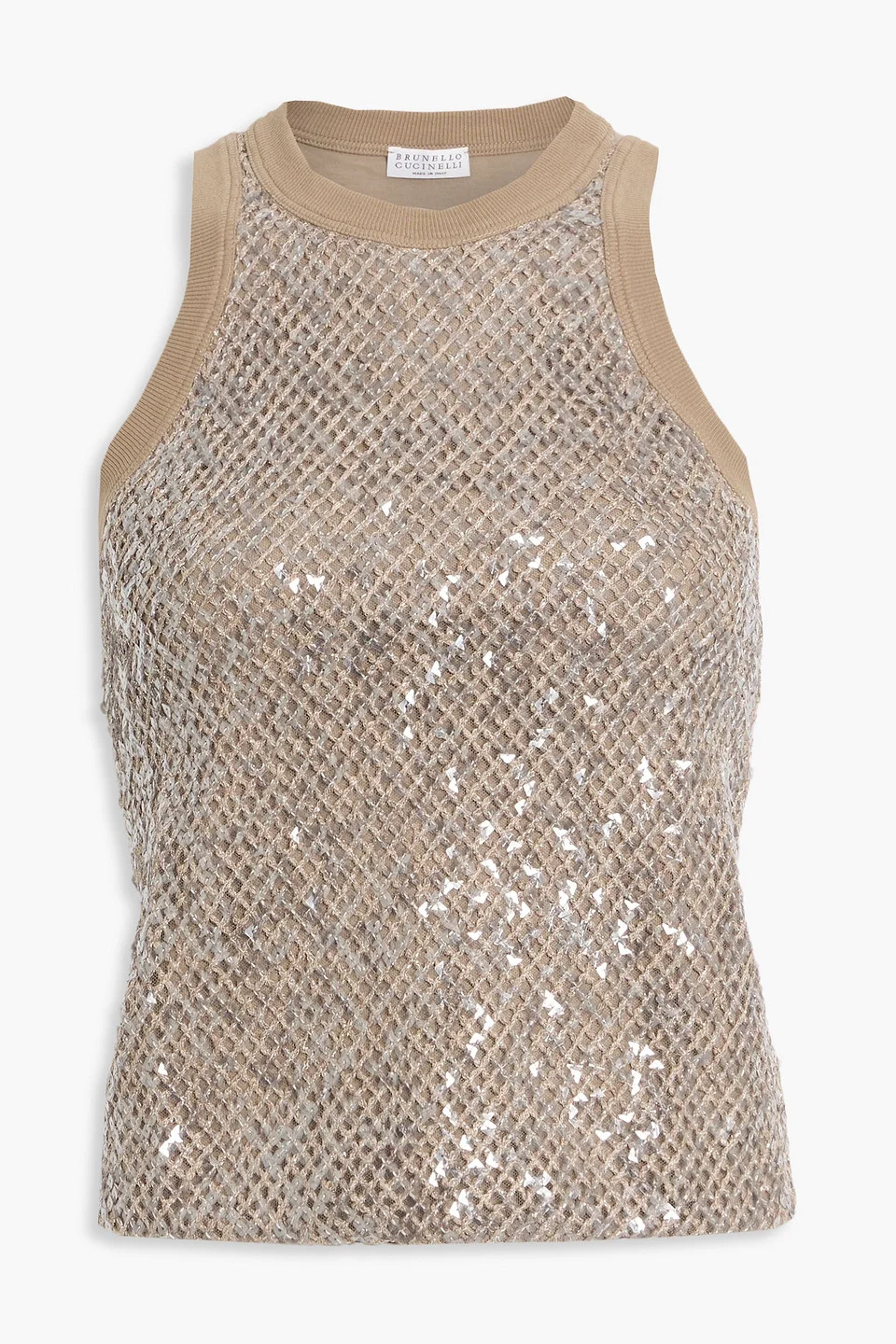 Tank tulle cotton-blend jersey sequins paneled slips on mid-weight, slightly stretchy fabric dry clean made in italy Craving a little sparkle? Scoop up Brunello Cucinelli's glam tank top while you can. It's made from cotton-blend jersey and tulle with sparkling sequins. Wear it with everything from tapered pants to denim and midi skirts. 93% Cotton 7% Elastane Product Code 46376663163113145
