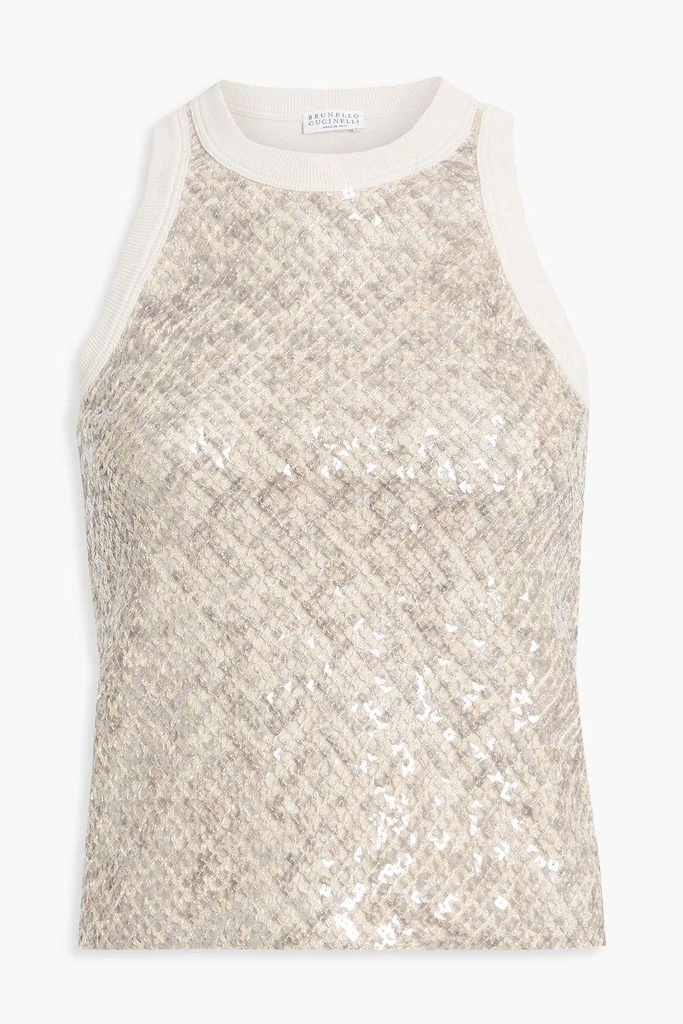 Tank tulle cotton-blend jersey sequins paneled slips on mid-weight knit dry clean made in italy Craving a little sparkle? Scoop up Brunello Cucinelli's glam tank top while you can. It's made from cotton-blend jersey and tulle with sparkling sequins. Wear it with everything from tapered pants to denim and midi skirts. 93% Cotton 7% Elastane Product Code 46376663163113149