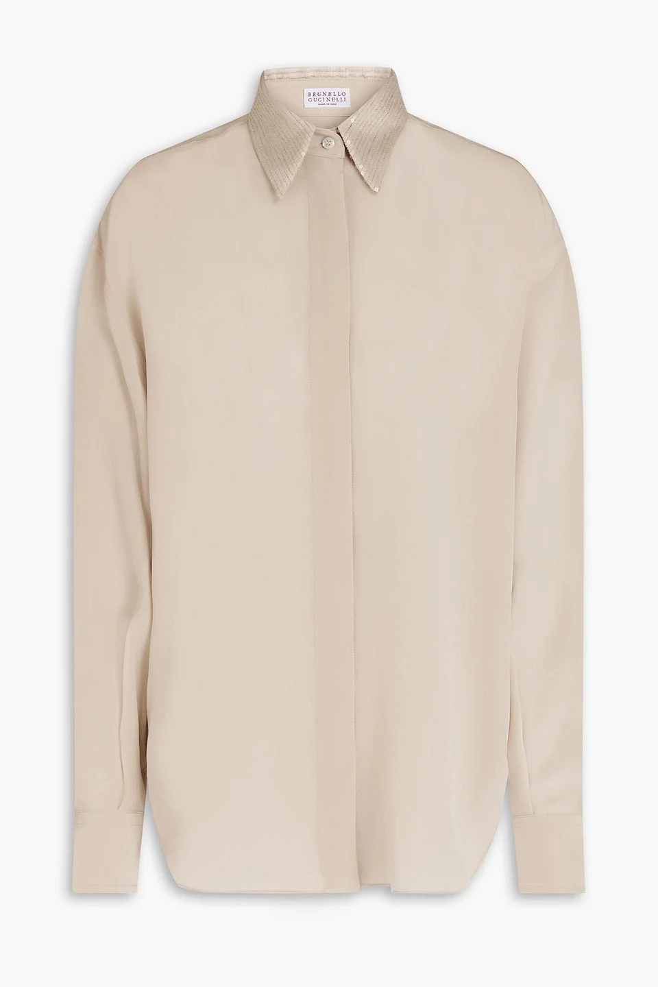 Shirt silk crepe de chine sequins mother-of-pearl buttons buttoned cuffs side slits partially concealed button fastenings through front lightweight, non-stretchy fabric dry clean made in italy Elevate your ensemble with this exquisite shirt from Brunello Cucinelli. Crafted from smooth silk crepe de chine, it features stunning sequin embellishments that catch the light beautifully. Perfect for upscale events or stylish dinners, this piece will have you feeling fabulous. 100% Silk 0% Trochus Niloticus (wild): Indonesia Product Code 1647597321006853