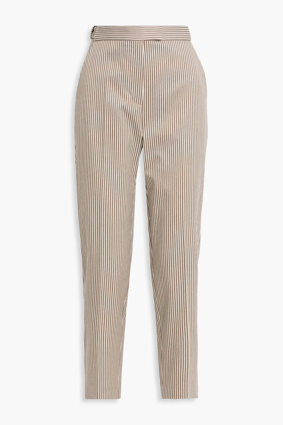 Tapered pants striped cotton-blend twill bead embellishment front slant pockets back welt pockets high-rise cut concealed hook, button and zip fastening at front mid-weight, slightly stretchy fabric dry clean made in italy Brunello Cucinelli's tapered pants are a wardrobe masterpiece, make your move while you can. They're cut from striped cotton-blend twill with a high-rise waist. Pair with a crisp shirt or simple tank, depending on your plans. 98% Cotton 2% Elastane Product Code 46376663163113765