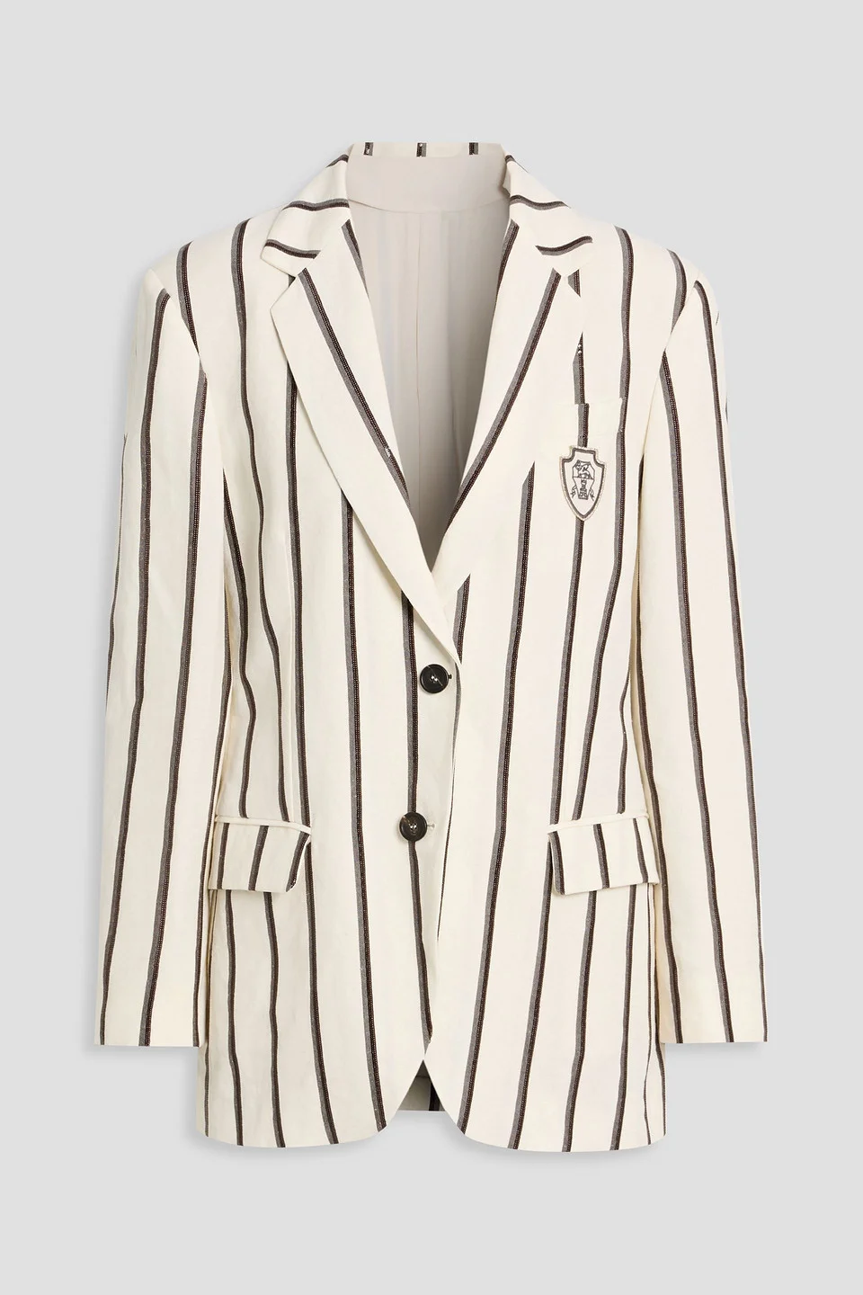 Blazer striped linen and cotton-blend logo-appliqued buttoned cuffs breast pocket front flap pockets button fastenings through front fully lined dual back vents mid-weight, non-stretchy fabric dry clean made in italy 58% Linen 42% Cotton Product Code 46376663163112879