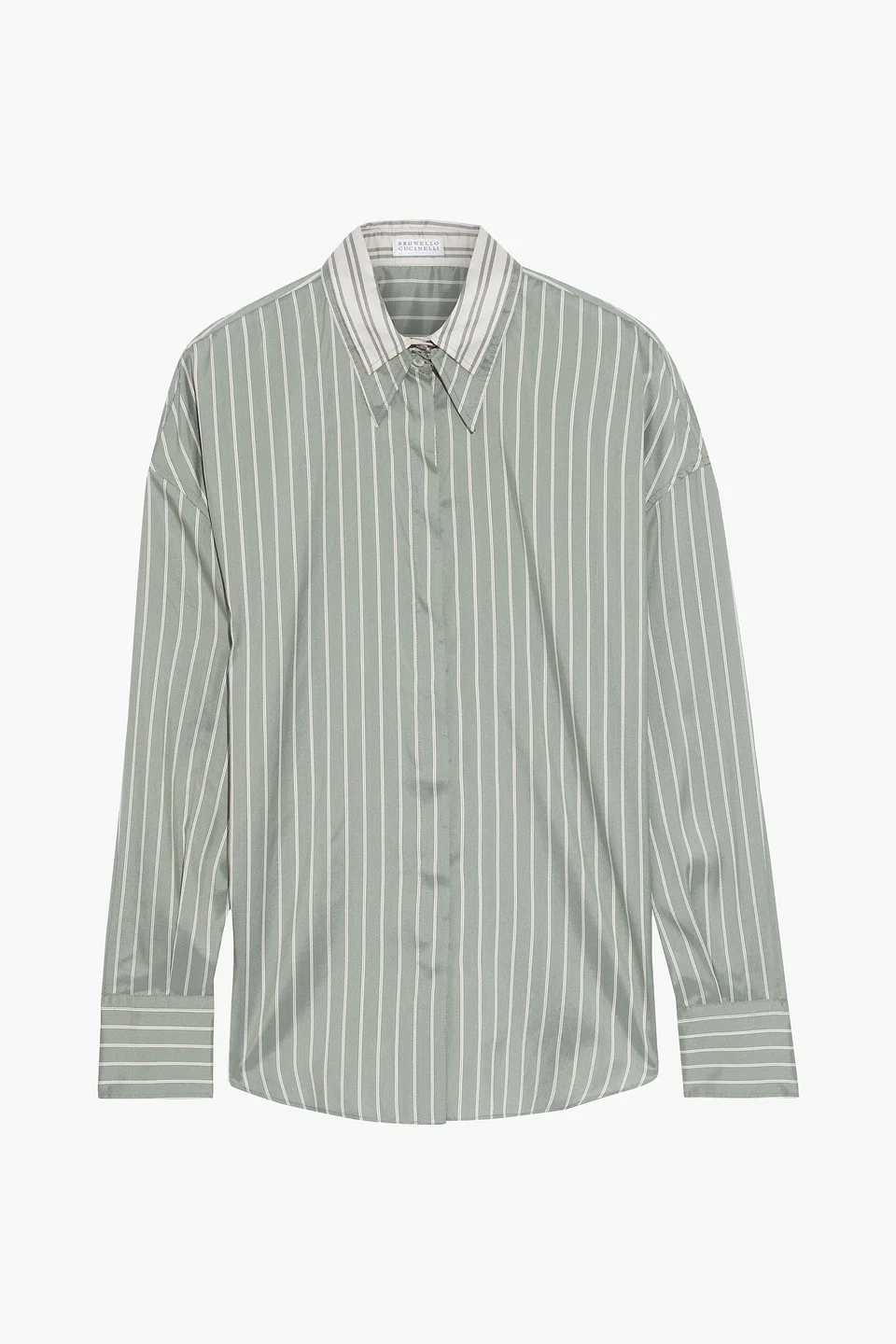 Shirt striped silk crepe de chine mother-of-pearl buttons pleated back layered buttoned cuffs partially concealed button fastenings through front curved hem non-stretchy fabric lightweight fabric dry clean country/region of origin: indonesia made in italy 100% Silk Product Code 24772899113257476