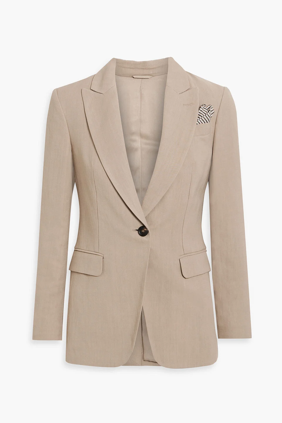 Blazer twill non-functioning buttoned cuffs breast pocket front flap pockets button fastening at front fully lined back vent mid-weight, non-stretchy fabric dry clean made in italy 73% Viscose 27% Linen Product Code 46376663162919794