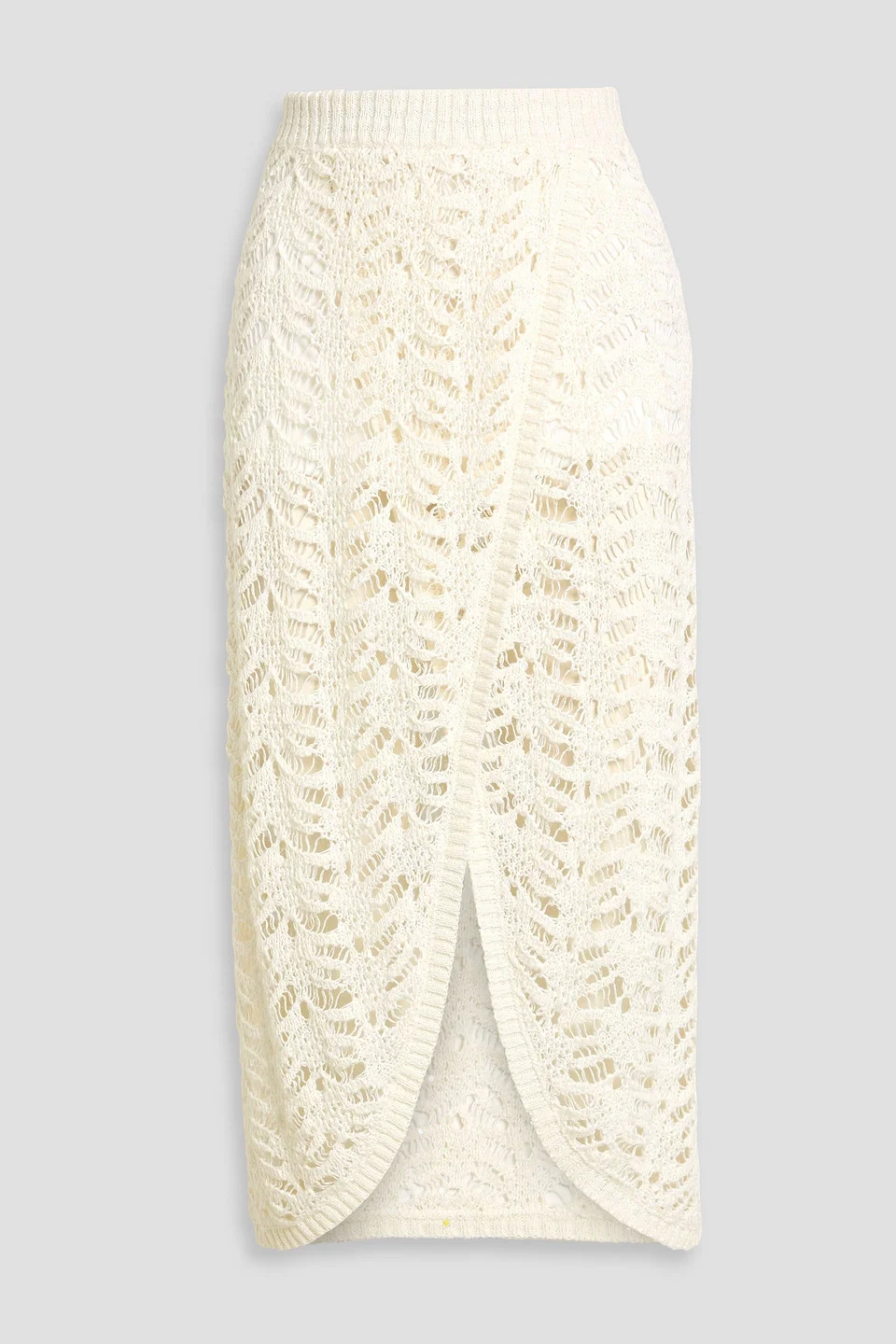 Wrap-effect embellished open-knit linen-blend midi skirt