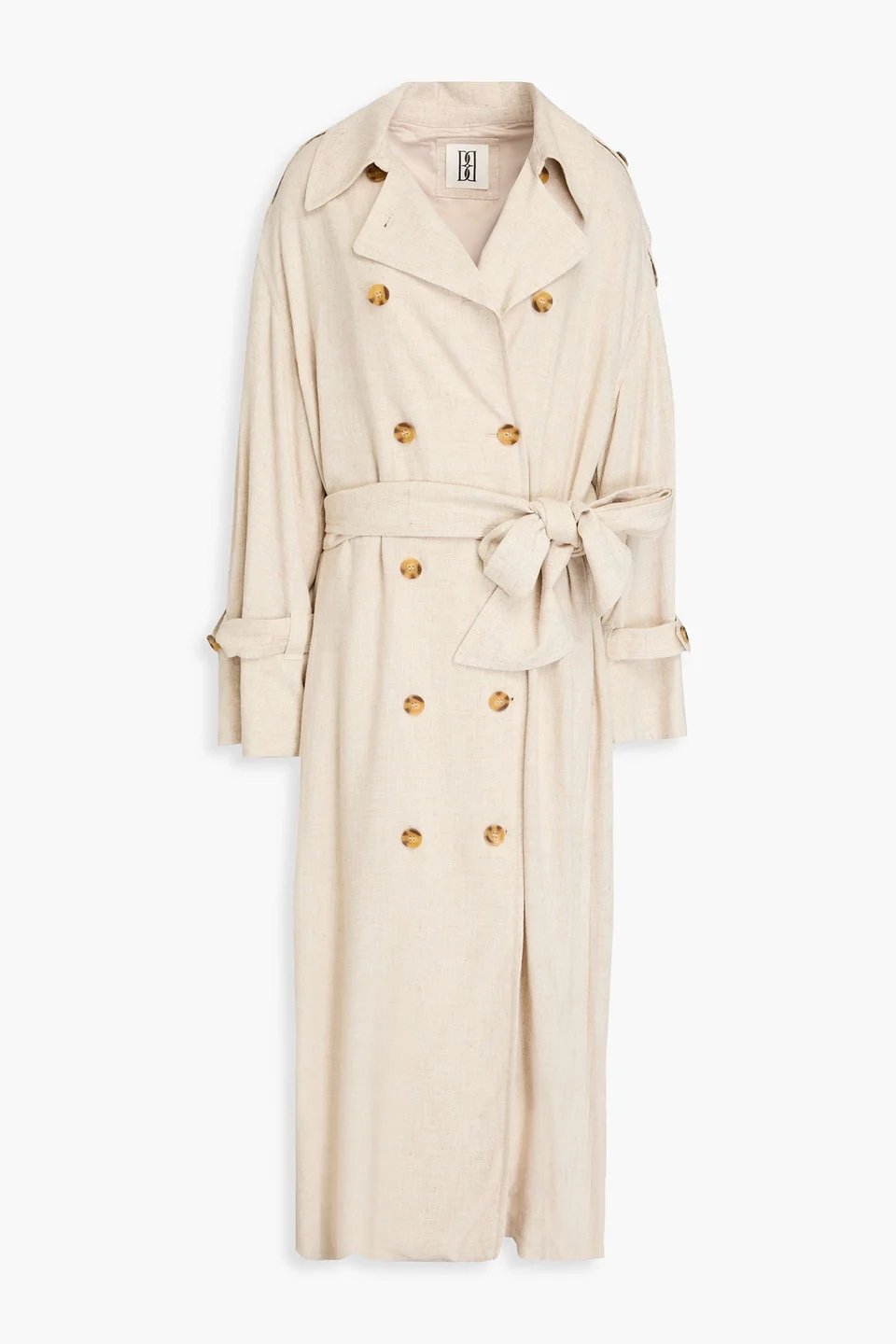 Trench coat woven buttoned epaulettes storm flap detachable waist tie two side slit pockets back vent partially lined button fastenings through double-breasted front mid-weight, non-stretchy fabric dry clean imported 85% Viscose 15% Linen Product Code 1647597352012851