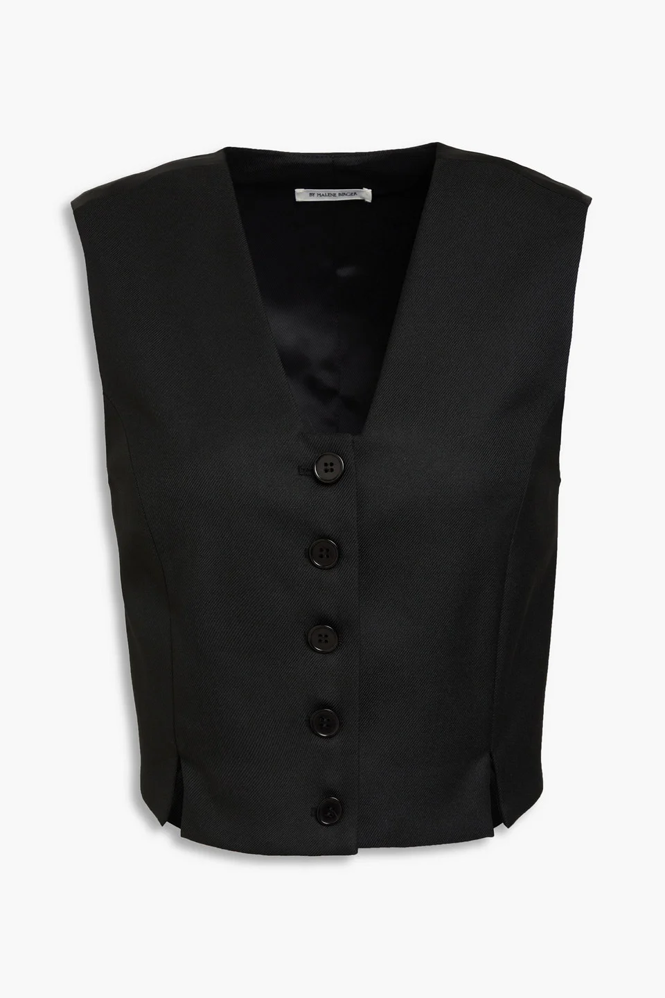 Vest twill satin paneled cropped half-belt button fastenings through front fully lined two front slits mid-weight, non-stretchy fabric dry clean imported 69% Recycled polyester 30% Viscose 1% Elastane Product Code 1647597359553187
