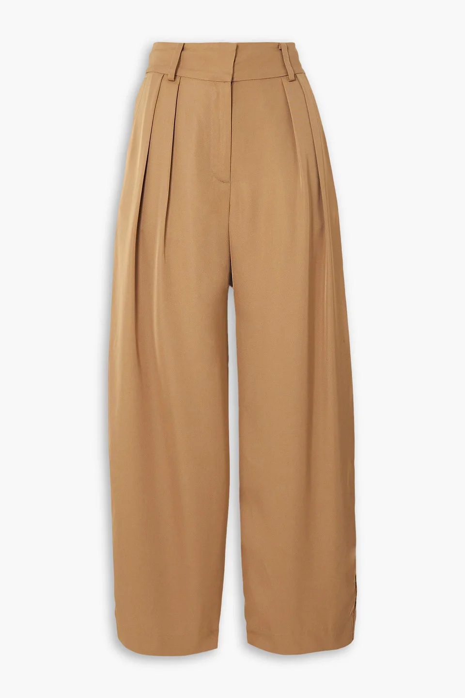 Wide-leg pants satin pleated two front slant pockets two back welt pockets belt loops high-rise cut concealed hook, button and zip fastening at front mid-weight, non-stretchy fabric machine wash or dry clean imported By Malene Birger's the brand to know if you're building a closet full of beautiful essentials. These satin 'Pascali' pants are tailored using acetate in a wide, pleated silhouette that fans and drapes gorgeously. 100% Acetate Product Code 1647597309308194