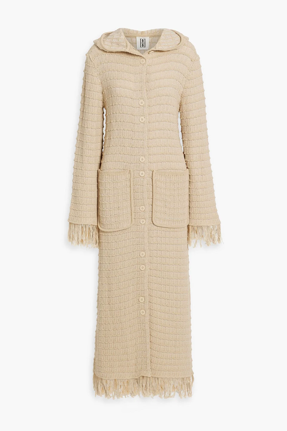 Cardigan crochet cotton-blend hooded frayed trims two front patch pockets button fastenings through front mid-weight knit hand wash or dry clean made in italy 91% Cotton 9% Polyamide Product Code 46376663162902136