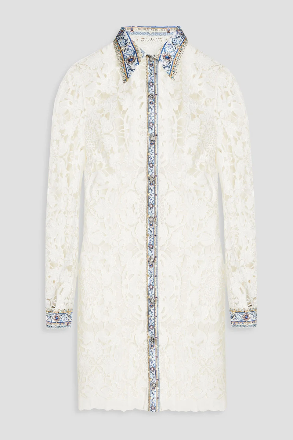 Crystal-embellished linen-blend guipure lace mini shirt dress