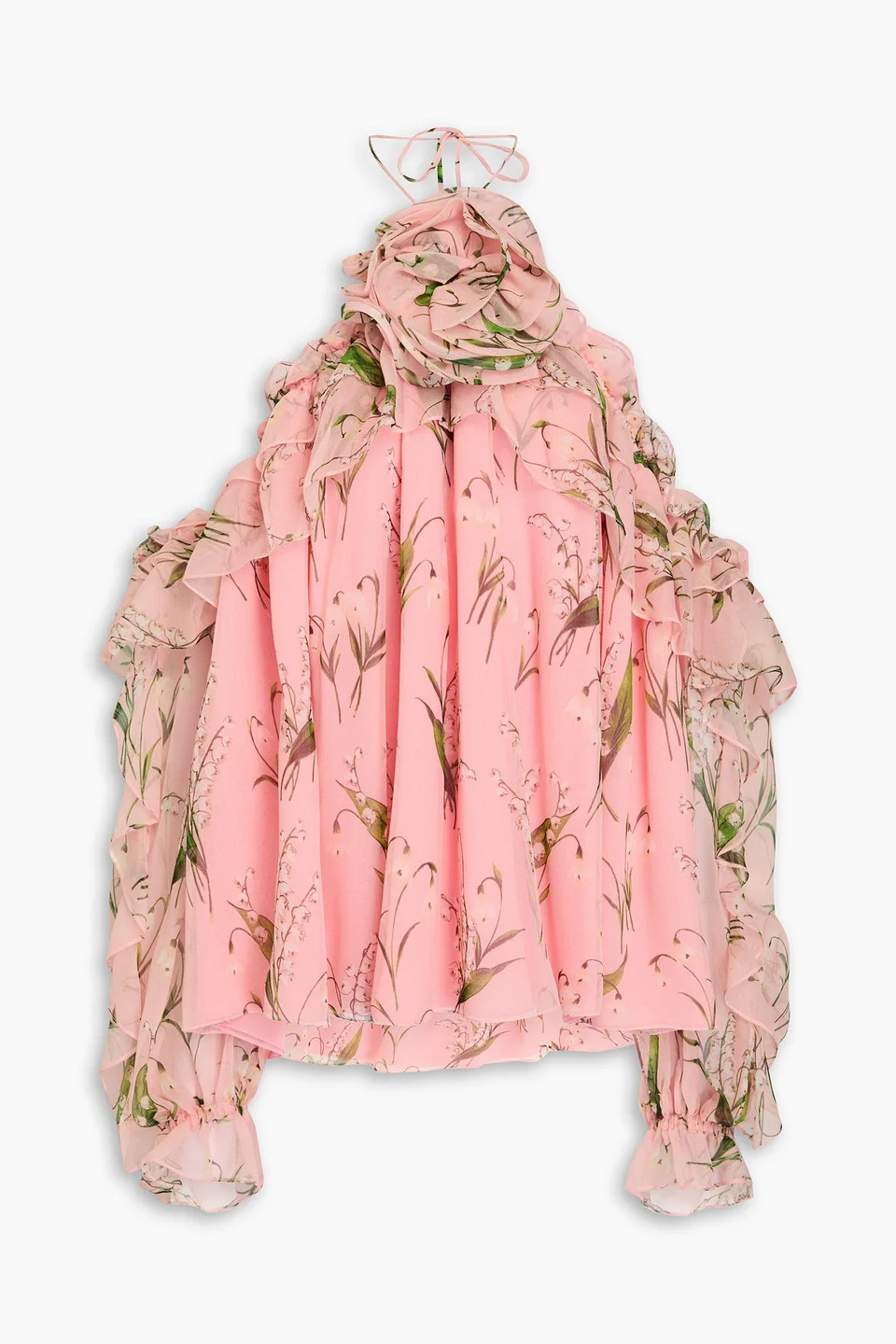 Ruffled Appliquéd Floral-print Georgette Halterneck Blouse