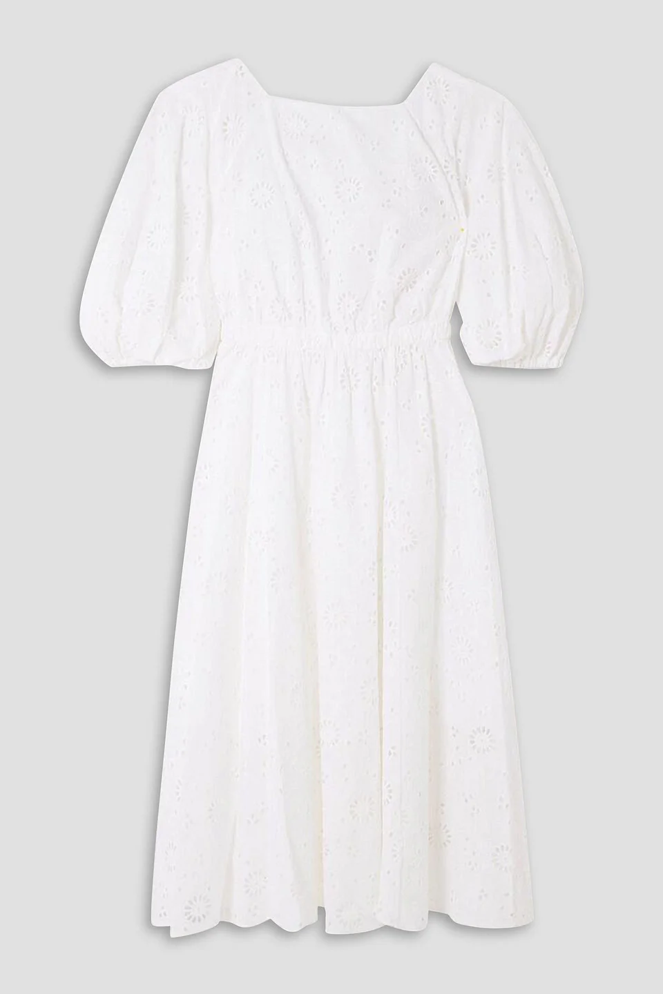 Dress broderie anglaise cotton pleated puffed sleeves concealed hook and zip fastening at back internal boning mid-weight, non-stretchy fabric dry clean made in italy Carolina Herrera’s midi dress has such a romantic design. It’s cut from broderie anglaise cotton with an open-back, puffed sleeves and a boned bodice. Complete your look with a pair of heels. 100% Cotton Product Code 1647597325621342
