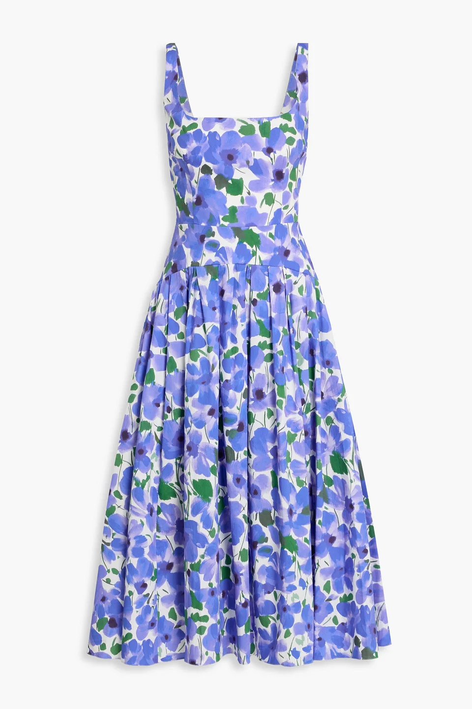 Pleated floral-print cotton-blend poplin midi dress Blue