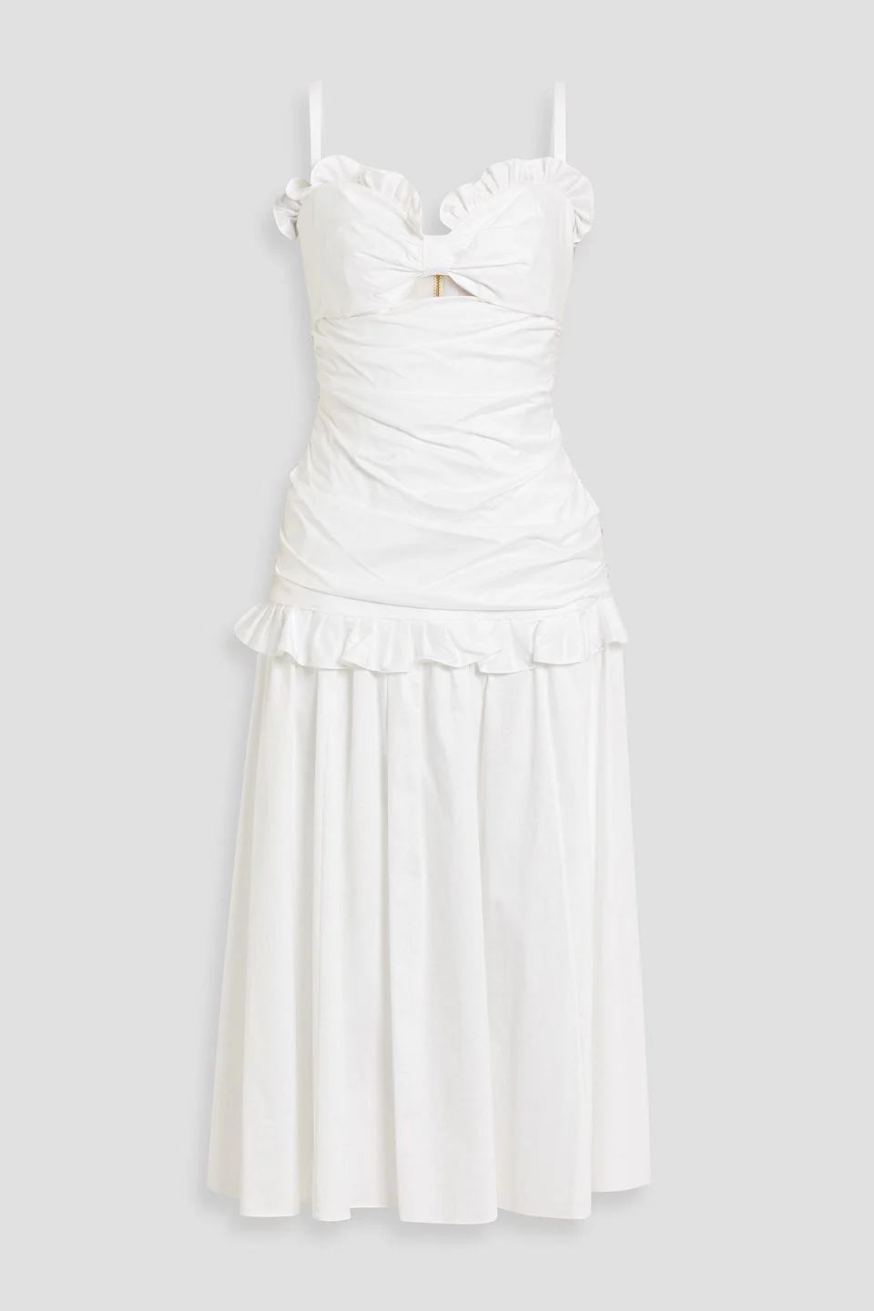 Dress cotton-blend poplin ruffled trims cutout ruched concealed zip fastening along back mid-weight, slightly stretchy fabric dry clean Carolina Herrera’s cotton-blend poplin midi is serving sweet but playful vibes with its ruffled trims and flirty cutout. It’s the perfect throw-on-and-feel-pretty dress – whether you’re brunching, beach strolling or just twirling around. 97% Cotton 3% Elastane Product Code 46376663163005694