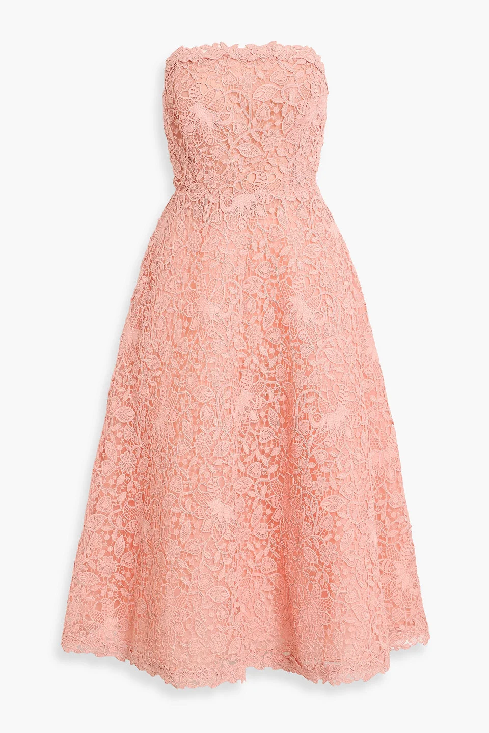 Strapless dress guipure lace flared hem concealed hook and zip fastening at back internal bustier mid-weight, non-stretchy fabric dry clean Made from gorgeous guipure lace, Carolina Herrera’s strapless midi dress is such a pretty blush hue. The flared skirt and strapless silhouette have a feminine, vintage-inspired feel – just add heels and a mini bag to complete your look. 100% Polyester Product Code 46376663163005888