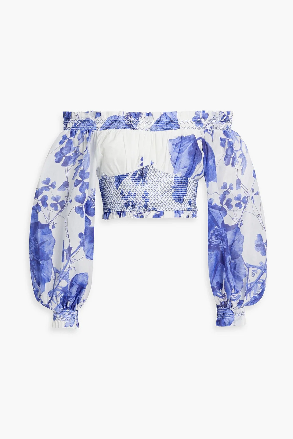 Off-the-shoulder top floral-print cotton-voile cropped smocked concealed zip fastening along side fully lined lightweight, non-stretchy fabric hand wash made in spain 90% Cotton 10% Polyester Product Code 46376663162907909