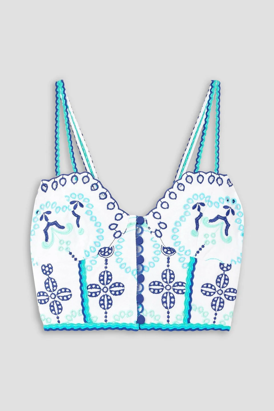 Top broderie anglaise cotton-blend scalloped trims cropped shirred button fastenings through front mid-weight, non-stretchy fabric dry clean imported 60% Cotton 20% Linen 20% Polyester Product Code 46376663163069313