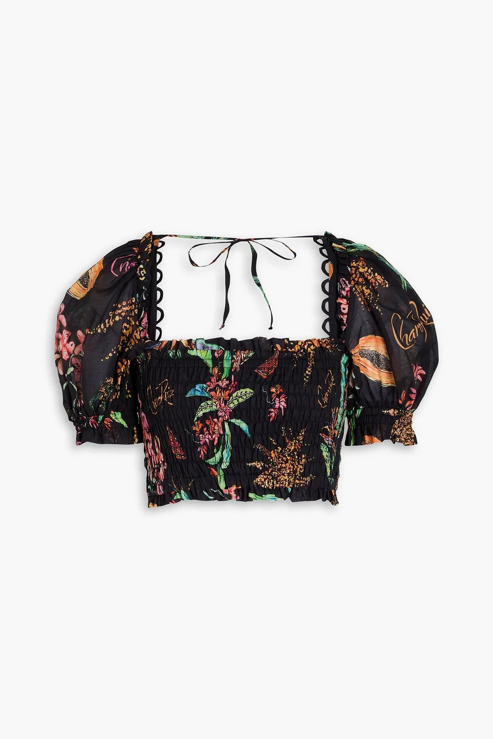 Top printed voile cotton-blend ruffled trims guipure lace trims shirred cropped puffed sleeves ties at neck lightweight, non-stretchy fabric hand wash imported 90% Cotton 10% Polyester Product Code 46376663162831665
