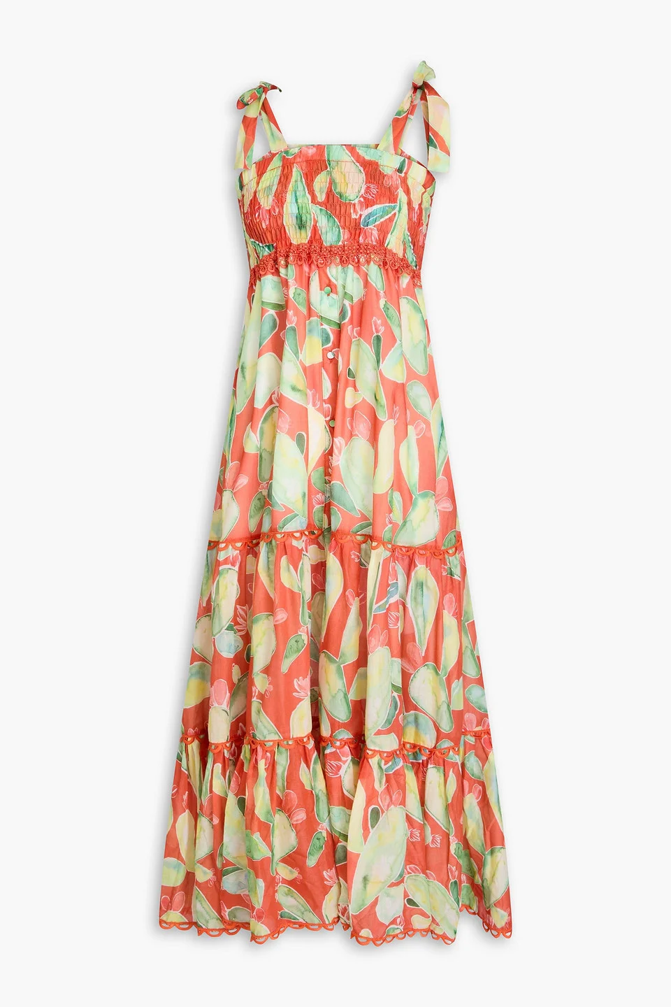 Dress printed voile cotton-blend guipure lace trims tiered button-detailed shirred ties at shoulders partially lined lightweight, non-stretchy fabric hand wash imported 90% Cotton 10% Polyester Product Code 46376663162895377