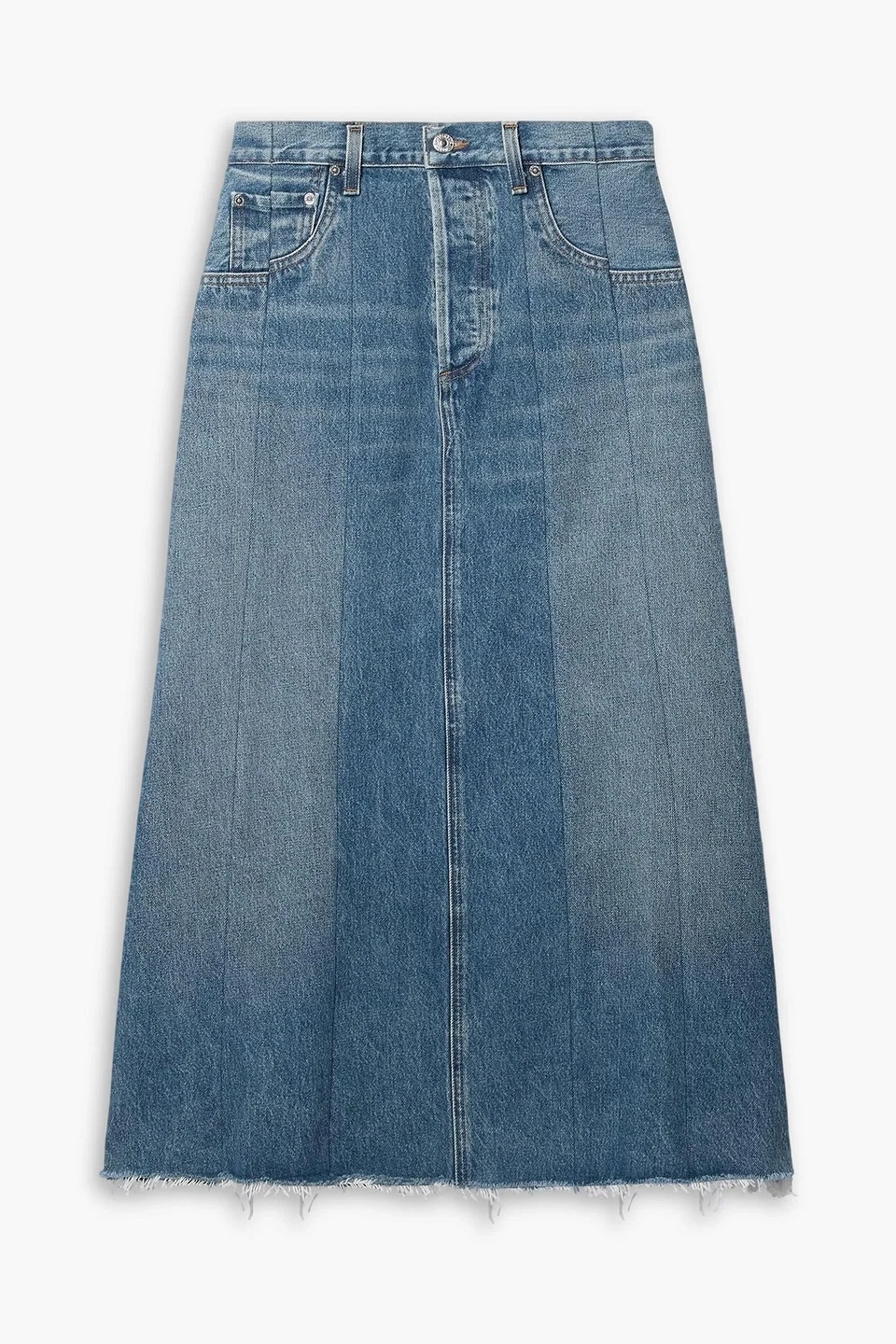 Raian frayed paneled organic denim midi skirt