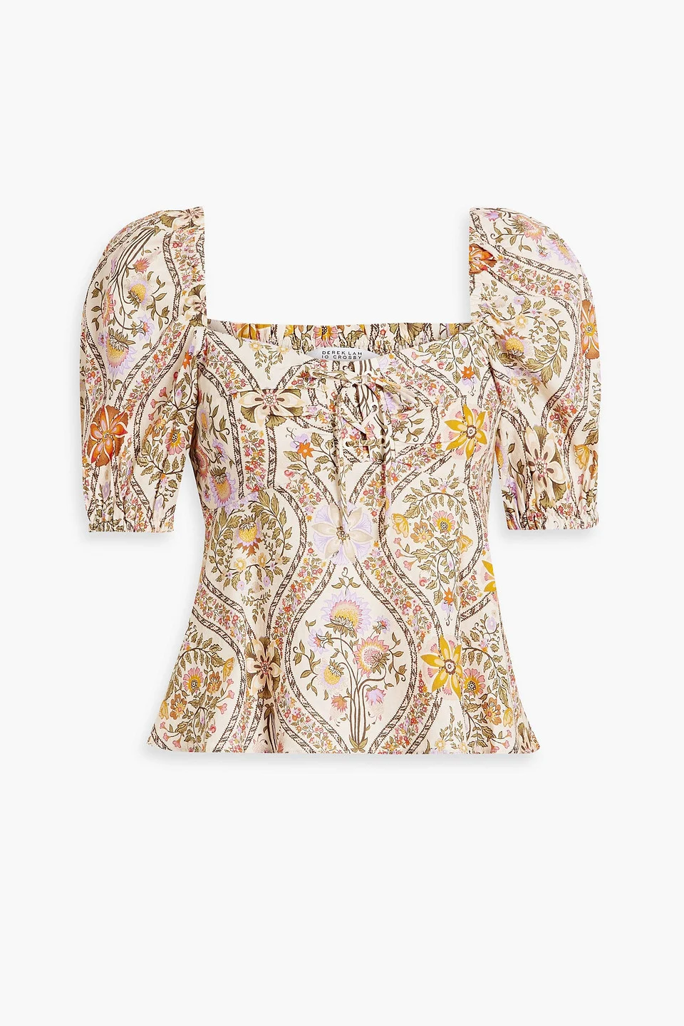 Top printed linen-blend bow-detailed shirred elasticated cuffs slips on mid-weight, non-stretchy fabric dry clean imported 55% Linen 45% Rayon Product Code 1647597338283954