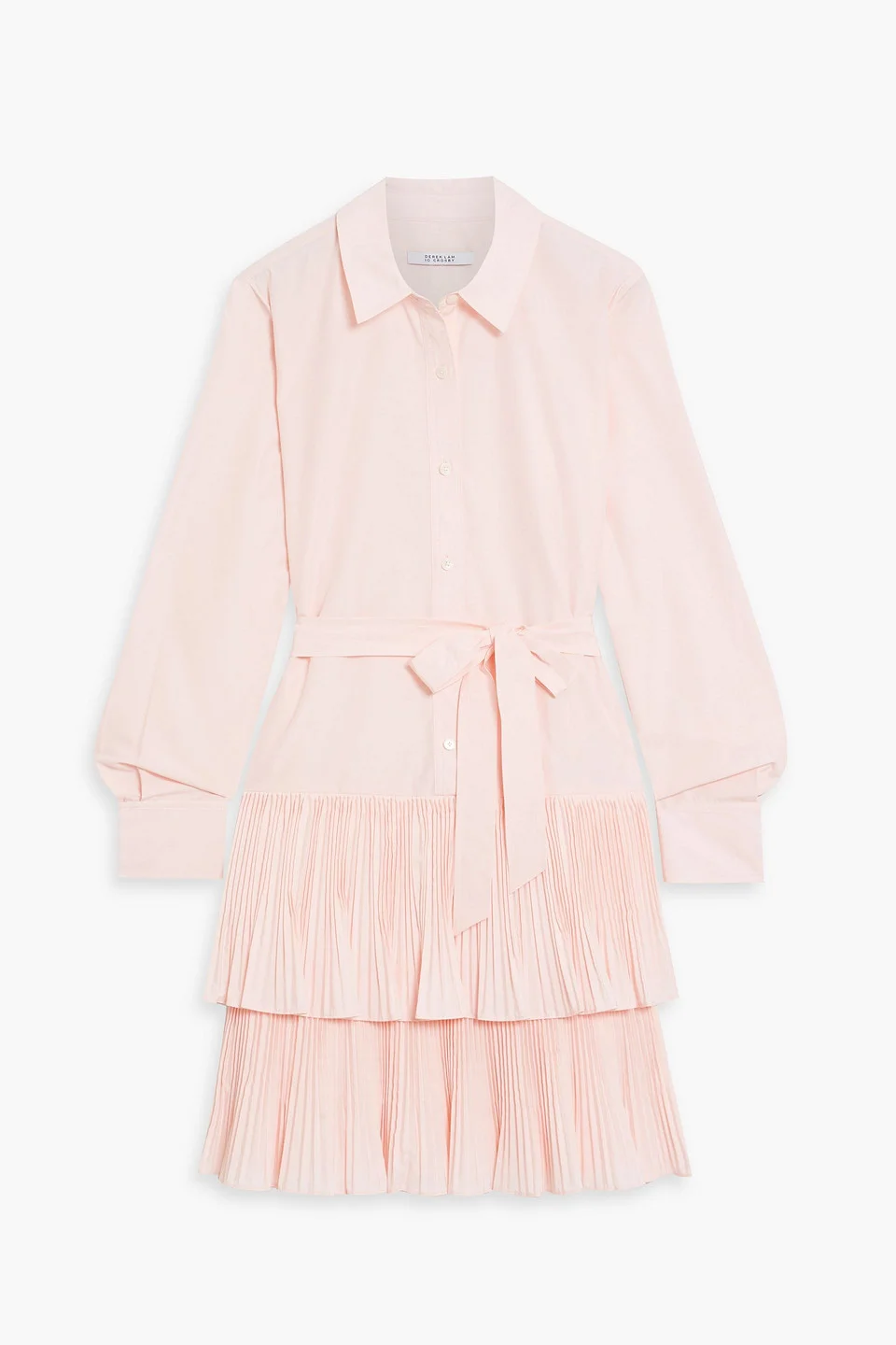 Shirt dress poplin plisse tiered pleated back detachable waist tie belt loops buttoned cuffs layered hem button fastenings along front mid-weight, non-stretchy fabric dry clean imported 51% Recycled polyester 32% Polyester 17% Cotton Product Code 1647597352306567