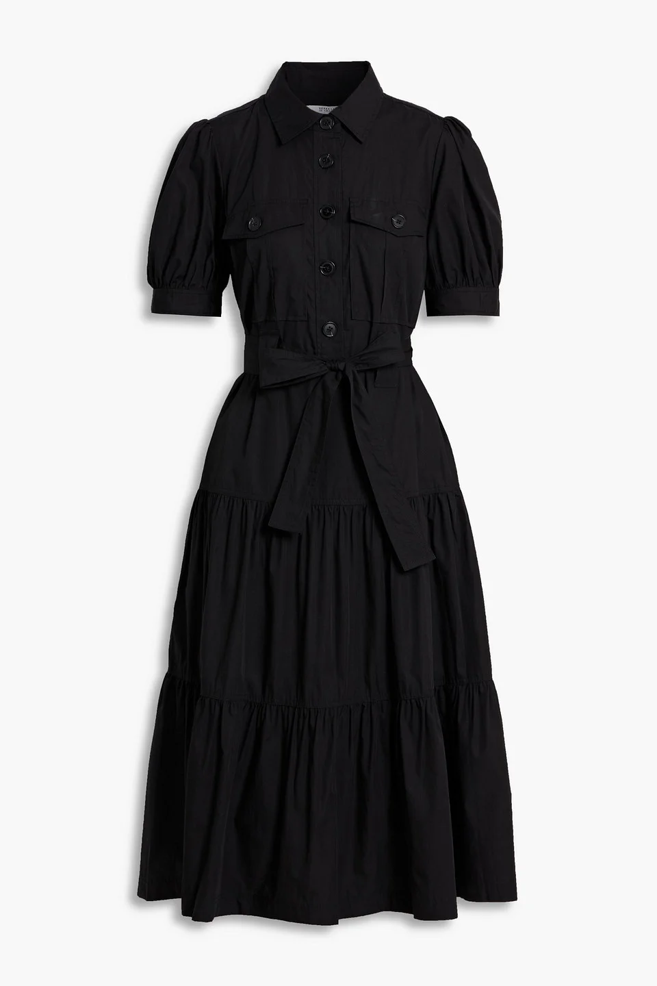 Shirt dress cotton-poplin tiered detachable waist tie puffed sleeves breast pockets side slit pockets button fastenings along front mid-weight, non-stretchy fabric dry clean imported 100% Cotton Product Code 46376663163125499