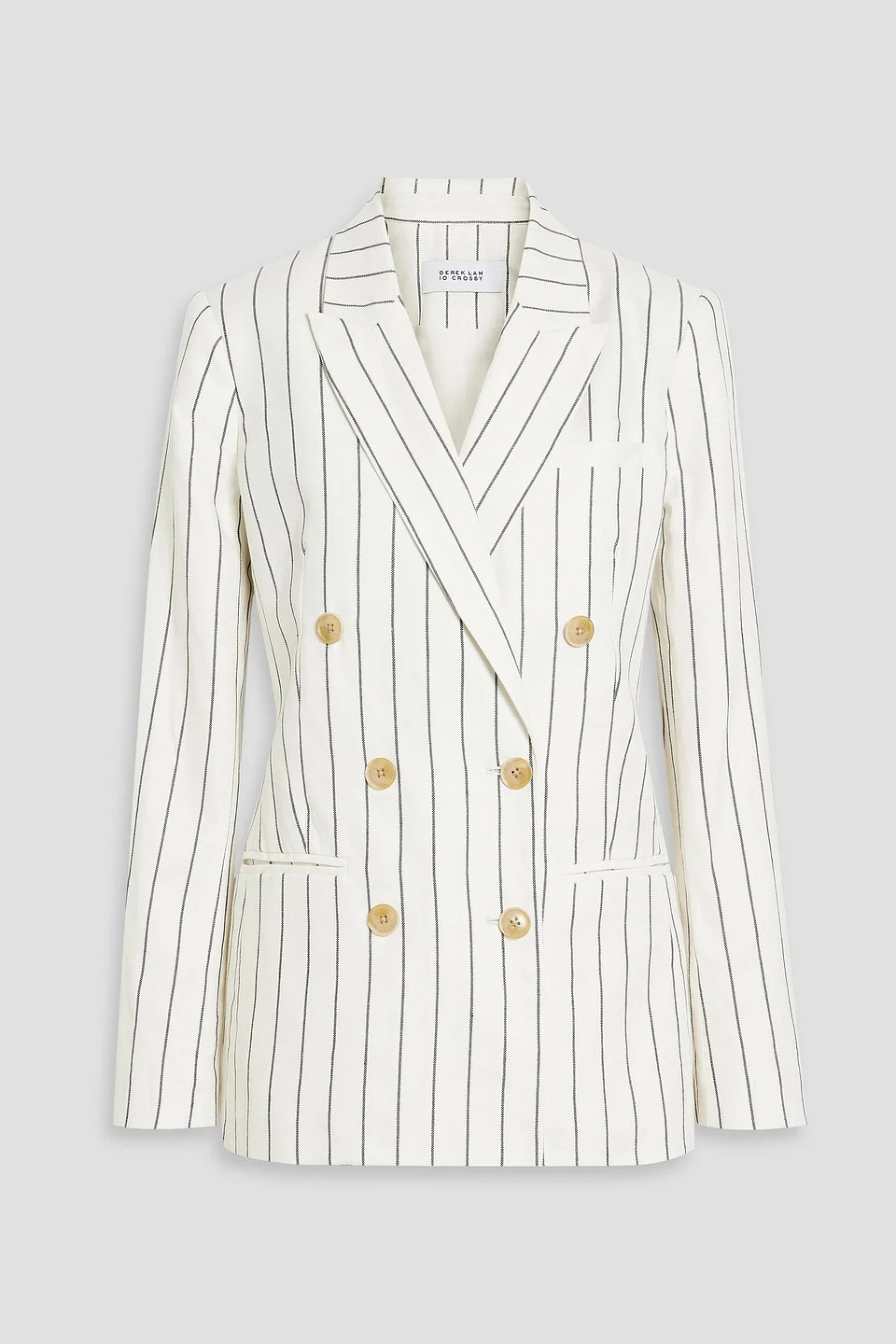 Blazer pinstriped linen and cotton-blend shoulder pads buttoned cuffs breast pocket two front welt pockets button fastenings through double-breasted front fully lined back vent dry clean imported 65% Linen 35% Cotton Product Code 1647597338064096
