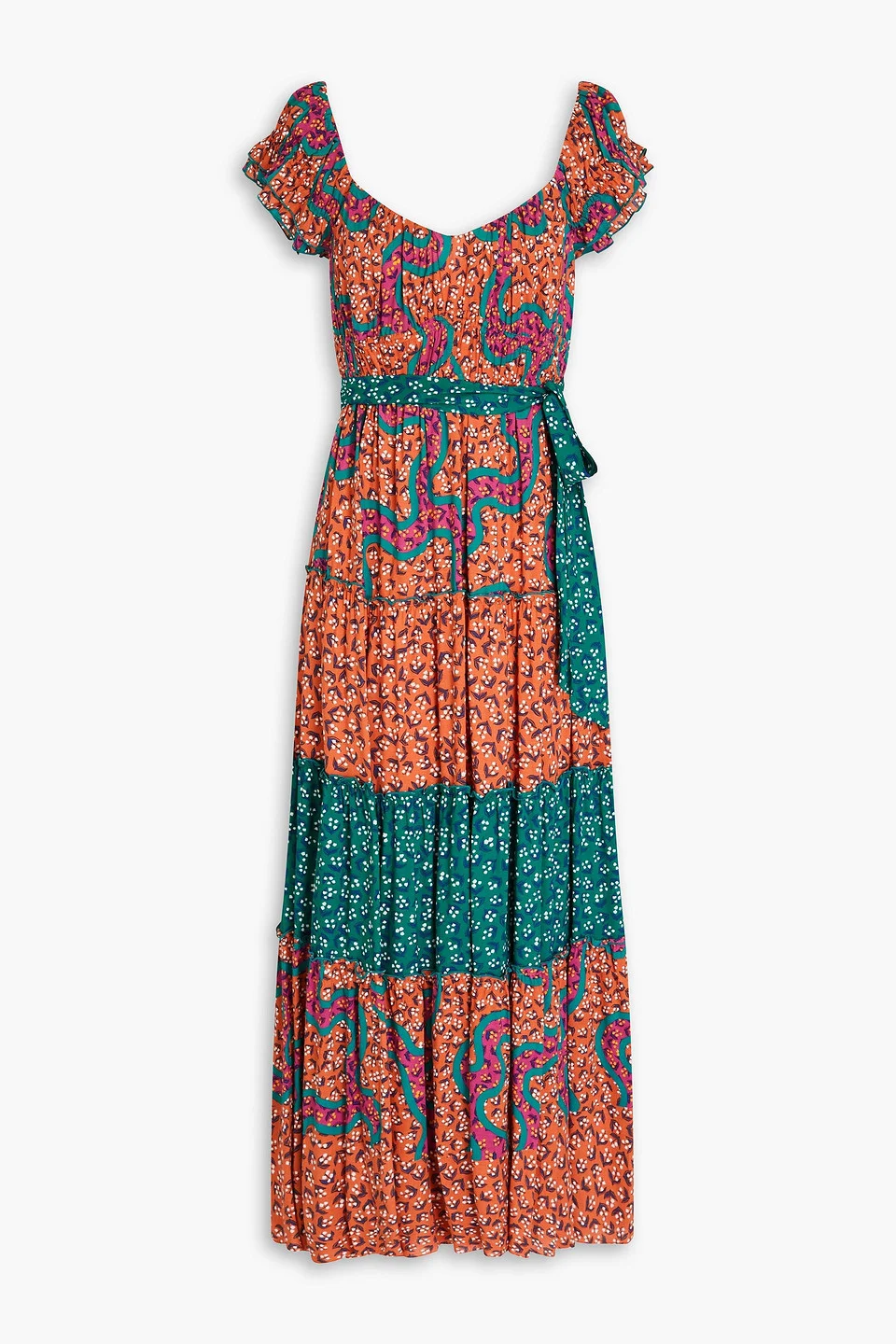 Dress printed mousseline gathered ruffled trims elasticated neckline detachable waist tie concealed hook and zip fastening at side fully lined mid-weight, non-stretchy fabric dry clean imported 100% Viscose Product Code 1647597345278582