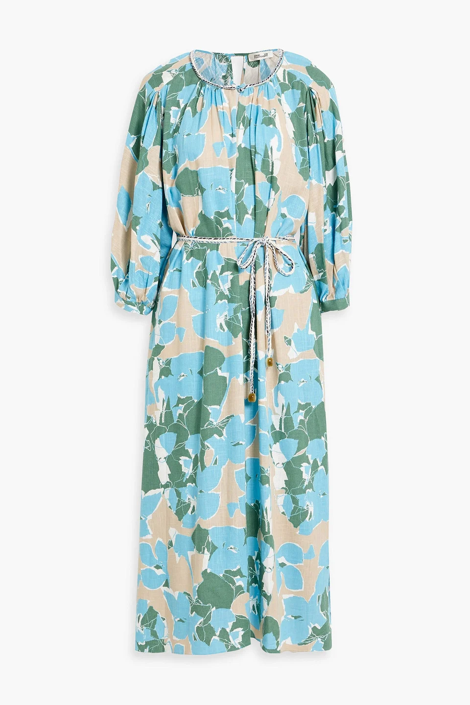 Dress floral-print slub woven embroidered trims keyhole back detachable waist tie puffed sleeves two side slit pockets side slits button-fastening keyhole at front mid-weight, non-stretchy fabric dry clean imported 67% Viscose 33% Linen Product Code 1647597359464360