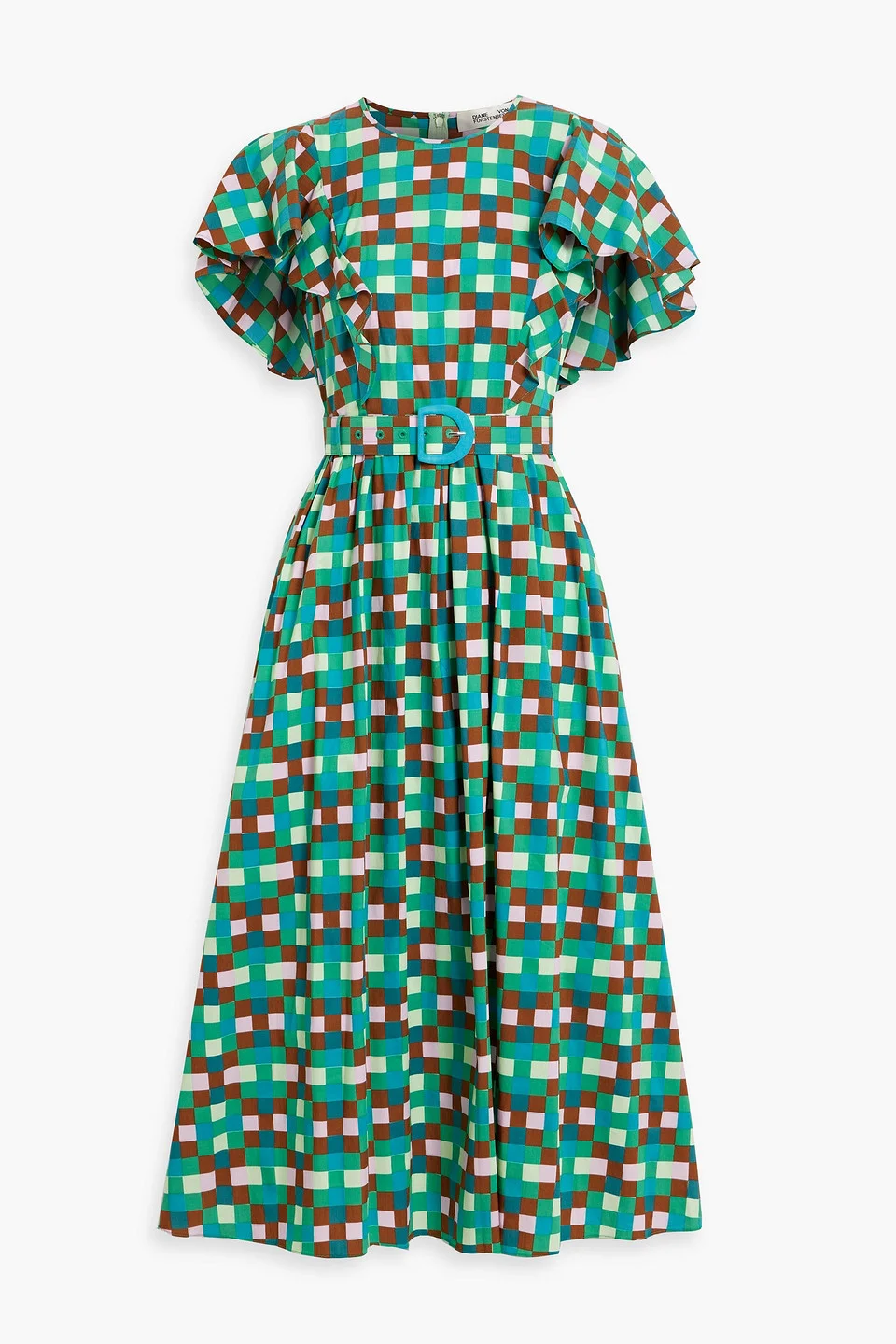 Dress checked poplin cotton-blend pleated detachable belt ruffled sleeves two side slit pockets concealed zip fastening along back partially lined mid-weight, slightly stretchy fabric dry clean imported 68% Cotton 28% Nylon 4% Spandex Product Code 1647597331765884