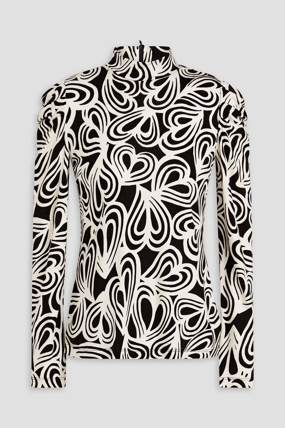 Turtleneck top printed jersey lyocell and wool-blend ruched sleeves concealed zip fastening along back slightly stretchy fabric mid-weight fabric dry clean imported 72% Lyocell 28% Wool Product Code 1647597333675858