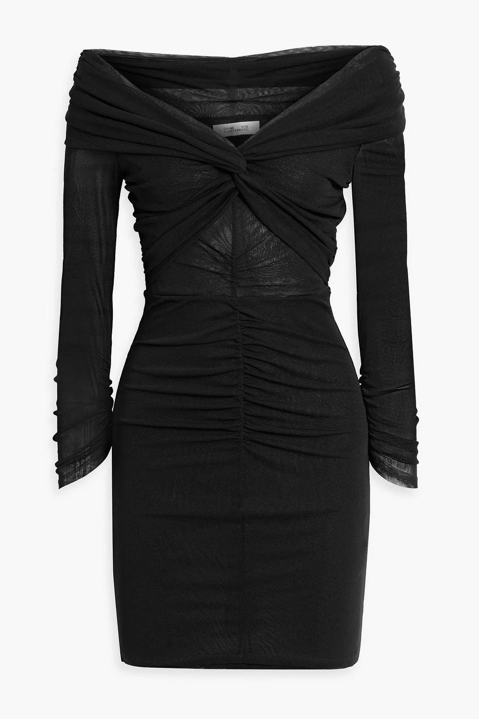 Off-the-shoulder dress stretch-mesh ruched twisted slips on partially lined lightweight, stretchy fabric dry clean imported 100% Nylon Product Code 1647597349532467
