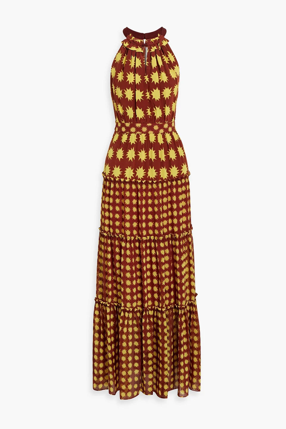 Dress printed crepe de chine tiered cutout concealed hook and zip fastening at side fully lined lightweight, non-stretchy fabric dry clean imported 100% Viscose Product Code 46376663162895946