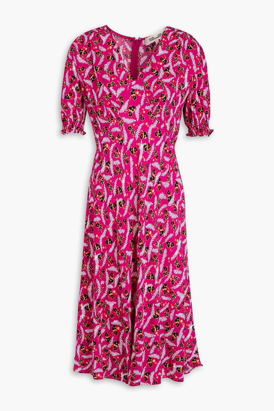 Dress printed crepe shirred trims ruffled cuffs concealed hook and zip fastening at back mid-weight, non-stretchy fabric dry clean imported 100% Viscose Product Code 1647597347696837