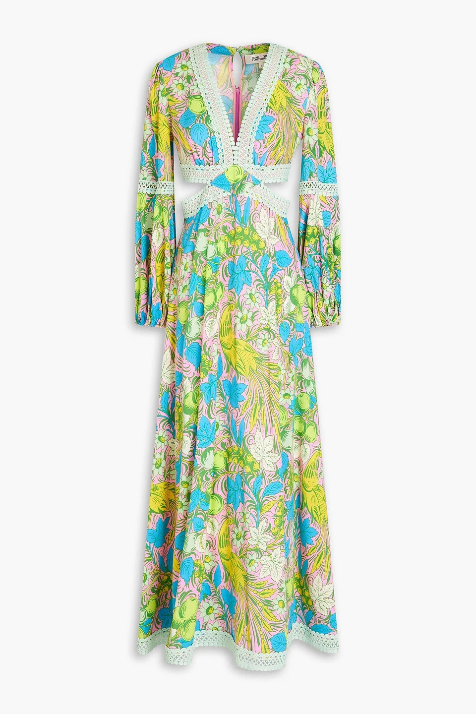 Dress floral-print crepe cutouts embroidered trims elasticated cuffs button-fastening keyhole at back concealed hook and zip fastening at back mid-weight, non-stretchy fabric dry clean imported 100% Rayon Product Code 1647597345275759