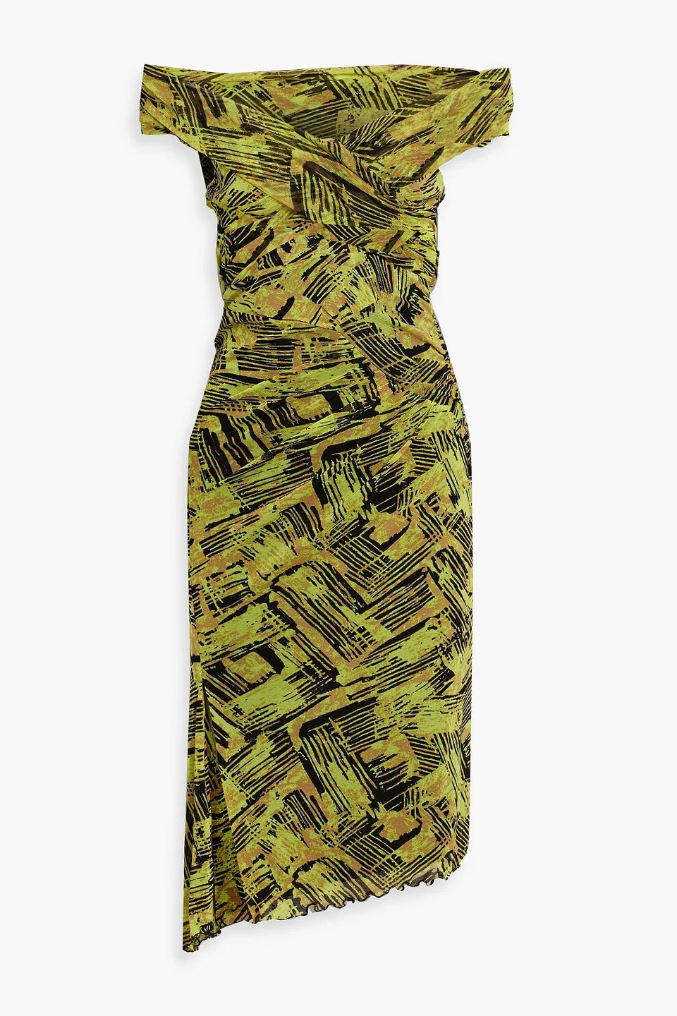 Off-the-shoulder dress printed mesh ruched crossover front side slit slips on fully lined lightweight, stretchy fabric dry clean imported 100% Nylon Product Code 1647597358718775