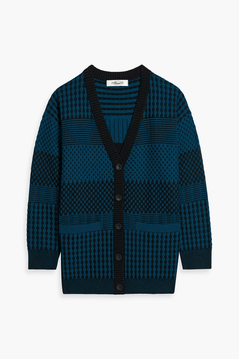 Cardigan checked jacquard-knit ribbed trims two front welt pockets button fastenings through front mid-weight knit dry clean imported 35% Viscose 31% Acrylic 20% Wool 14% Nylon Product Code 1647597349534386