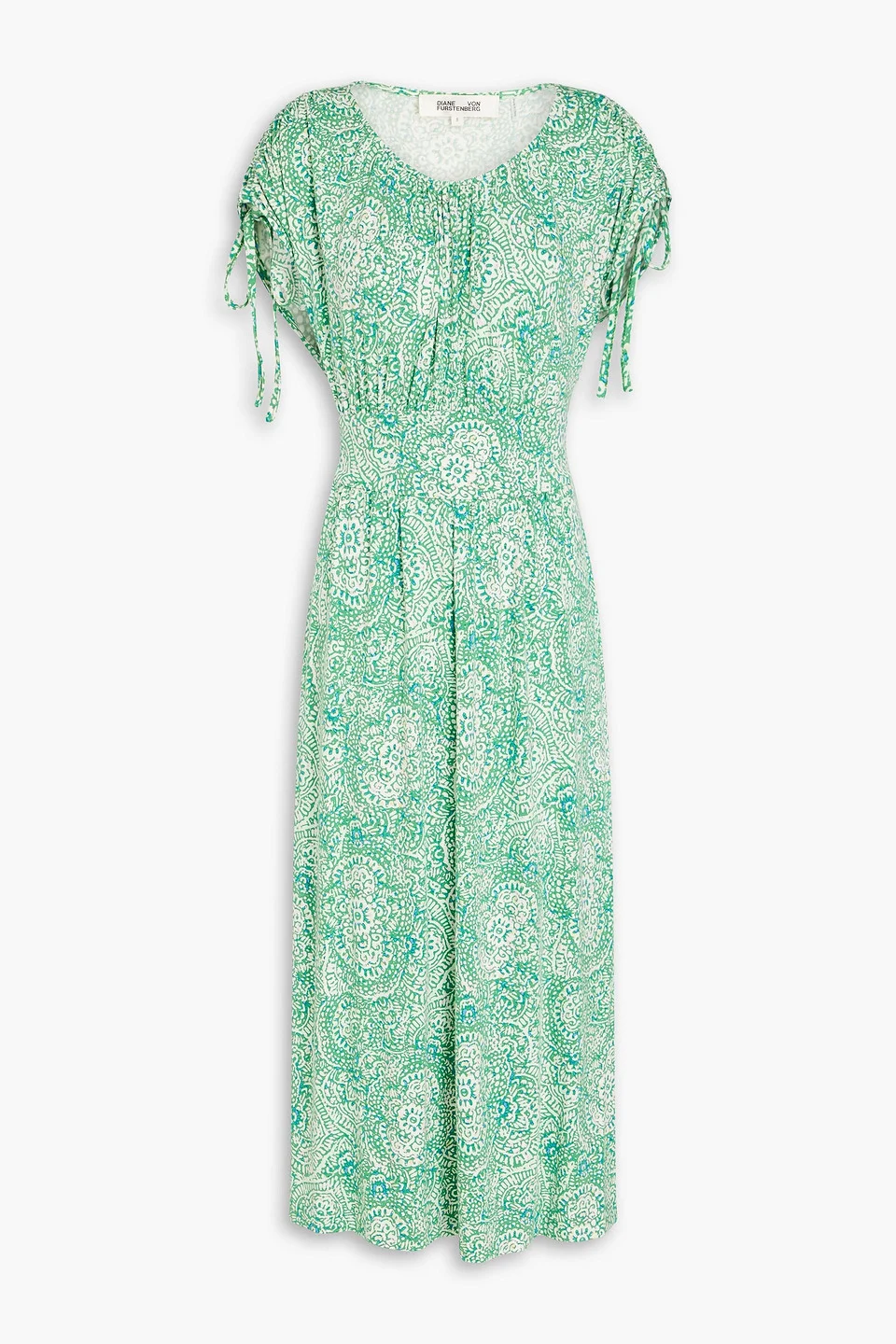 Dress printed jersey drawstring ties waist ties ruched sleeves concealed zip fastening along side mid-weight, stretchy fabric dry clean imported 95% Viscose 5% Spandex Product Code 1647597347909819