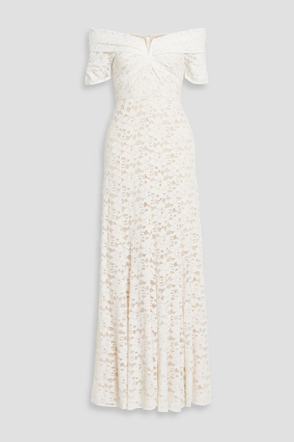 Off-the-shoulder dress corded lace draped elasticated shoulders concealed hook and zip fastening at back internal boning fully lined lightweight, slightly stretchy fabric dry clean imported 96% Nylon 4% Spandex Product Code 46376663162895981