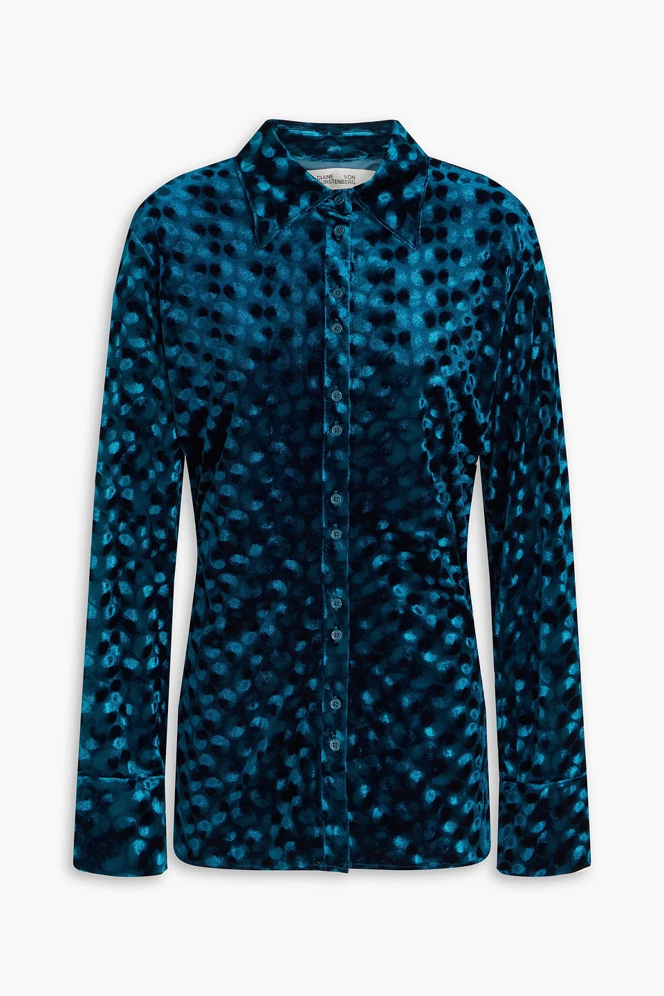 Shirt printed stretch-velvet ruched buttoned cuffs button fastenings through front fully lined mid-weight, stretchy fabric dry clean imported Feeling festive? The ‘Soluck’ shirt by Diane von Furstenberg is your latest and greatest find. With its rich stretch-velvet fabric and elegant ruched detailing, it’s a standout choice for any occasion. Wear it with your favorite jeans for a stylish yet relaxed vibe. 93% Polyester 7% Spandex Product Code 1647597339781876