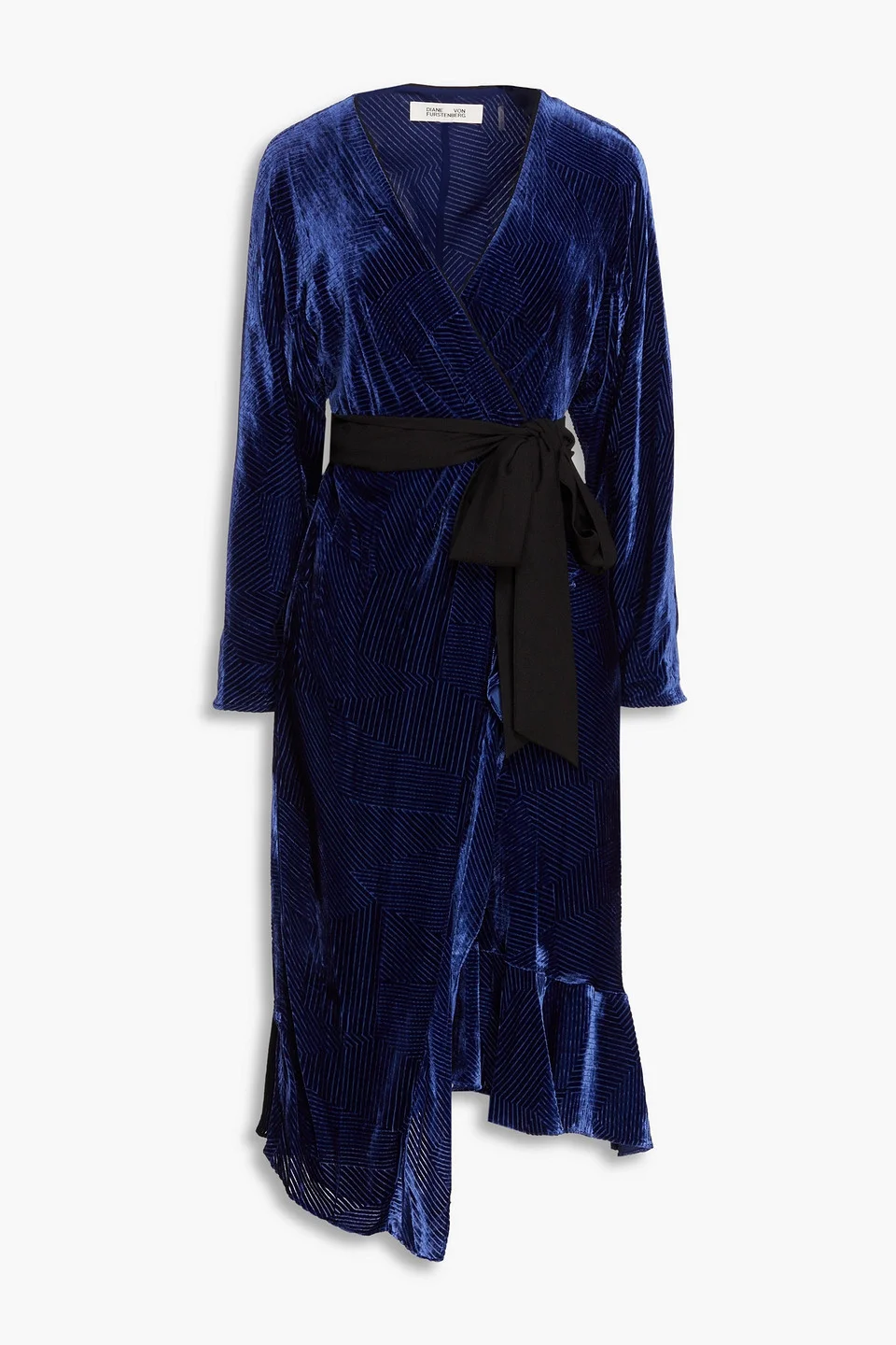 Wrap dress devore-velvet crepe trims ruffled fully lined asymmetric hem ties at waist non-stretchy fabric mid-weight fabric dry clean imported 75% Viscose 25% Silk Product Code 13452677151062095